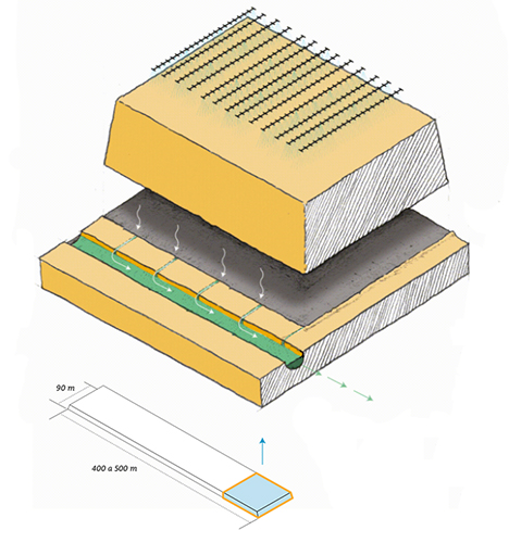Ilustración 4. Esquema de sección de pila de lixiviación de salmuera. Fuente: SQM