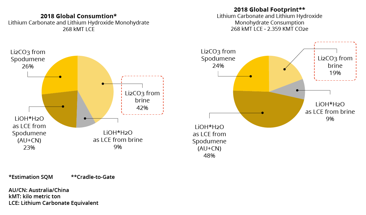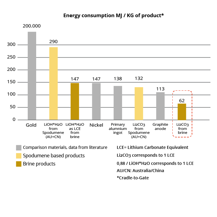 La producción de carbonato de litio (Li2CO3) en Chile tiene un consumo bajo de energía, si se le compara con su producción en otros países en base a espodumena como ocurre por ejemplo en Australia o China. La producción en base a salmuera, como se realiza en Chile, permite alcanzar consumos específicos de aproximadamente un 50% respecto a la producción en base a espodumena.