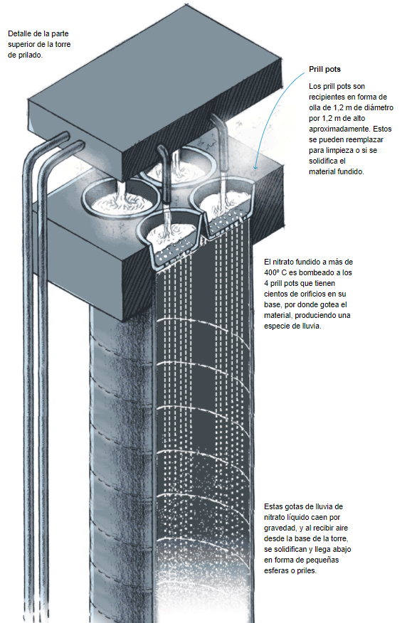 Una vez abandonada la planta de Cloruro de Potasio, el Nitrato de Potasio (KNO3), obtenido como concentración acuosa, ingresa a la Planta de Nitratos. En esta planta se realizan una serie de etapas para obtener como producto final pequeñas esferas de entre 2 a 3 milímetros de diámetro, conocidas como pril o granulado de Nitrato de Potasio. El proceso completo para la obtención de pril se denomina prilado.