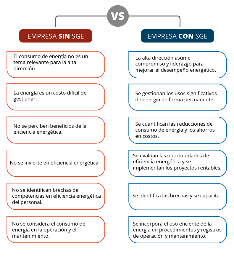 Ilustración 14. Diferencias en una empresa con y sin un SGE implementado. Fuente: Agencia SE 2017, Guía “Beneficios de los Sistemas de Gestión de Energía basados en ISO 50001 y casos de éxito”