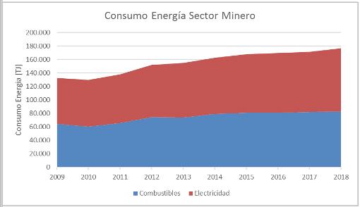 El sector Minero consume energía tanto en forma de Combustibles como de Electricidad en proporciones relativamente equivalentes. La evolución de este consumo muestra un incremento sostenido entre el año 2010 y 2018 de un 4,5% anual tanto para el consumo de combustibles como de electricidad.