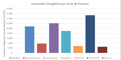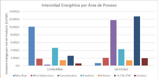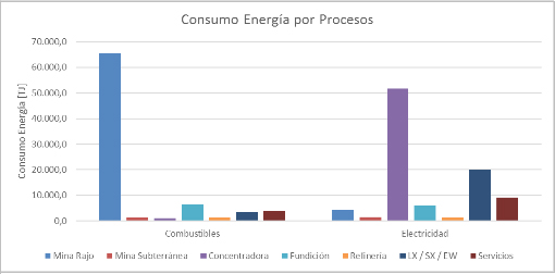 Este consumo se observa desagregado por área de proceso en la siguiente gráfica en donde se aprecia que el consumo principal de combustibles ocurre en el proceso de Mina Rajo y se explica por el combustible utilizado por los camiones para el transporte principalmente del mineral. Los restantes consumos de combustibles en otras áreas de proceso son considerablemente menores llegando a una décima parte en la fundición que corresponde a la segunda área con mayor consumo energético en forma de combustibles. Al observar los consumos de electricidad, por otra parte, se observa que el principal consumidor de este tipo de energético en el país es el área de concentrado que alcanza un valor sobre los 50.000 TJ anuales, seguida posteriormente por los tres principales procesos de hidrometalurgia (LX/SX/EX) con 20.000 TJ y de Servicios con un poco menos de 10.000 TJ.