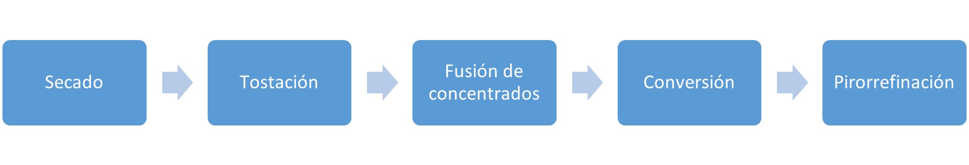 El proceso pirometalúrgico considera estas 5 etapas consecutivas que permiten incrementar progresivamente la ley o contenido de cobre del material sometido al proceso, desde el 30 a 40% inicial en el concentrado, hasta el 99,5% presente en el ánodo de cobre resultante de todo el proceso de fundición.