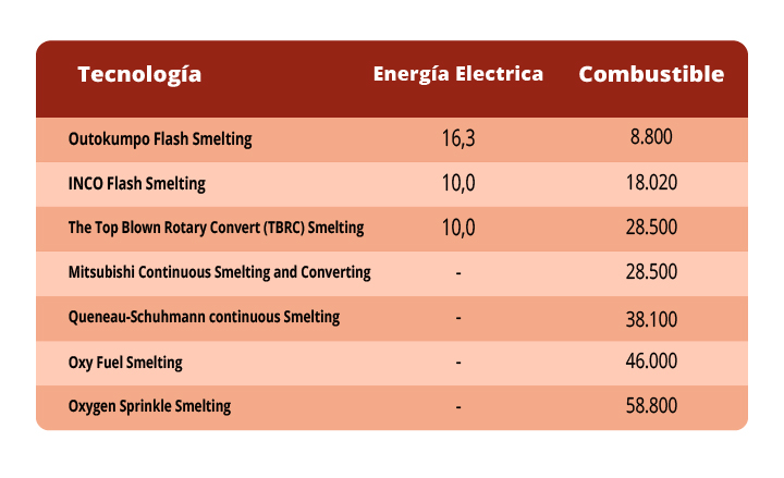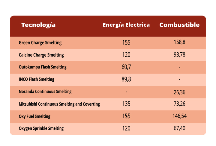 El proceso de fusión de concentrados tiene un importante consumo energético asociado al uso de combustibles, tal como se puede apreciar en la tabla siguiente. El nivel de consumo varía en función de cada línea tecnológica, pudiendo ir de un valor cercano a los 400 kWh por tonelada de cátodo de cobre, a sobrepasar los 7.000 kWh por tonelada de cátodo de cobre. Asimismo, se aprecia el consumo asociado al uso de electricidad, cuyo nivel de consumo es menor, variando entre los 60 kWh y 150 kWh por tonelada de cátodo de cobre.