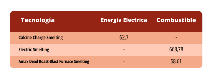 Al proceso de tostación se le asocia el consumo de electricidad como de combustibles, los cuales poseen un nivel de consumo que varía en función de la tecnología que se aplique. Para la tecnología convencional “Calcine Charge Smelting” el consumo eléctrico corresponde a 62,7 kWh por tonelada de cátodo de cobre; respecto a las tecnologías “Electric Smelting” y “Amax Dead-Roast Blast Furnace Smelting”, el consumo energético respectivamente corresponde a 668,78 kWh y 58,61 kWh por tonelada de cátodo de cobre. Esta información se representa en la tabla a continuación.